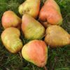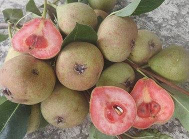 1847 gefunden, angenehm süß schmeckende, mittelgroße Birne mit rosarotem Fleisch, auffällige, glänzend schwarzrote Triebe, mittelstark, kompakt wachsend, bis in mittlere Höhenlagen.